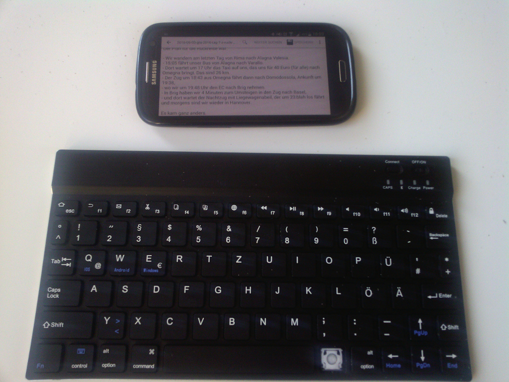 Die Powerbank (nicht im Bild) hat Frank und Olafs Telefone manchmal mitversorgt. Die Tastatur hat unterwegs irgendwo eine unwichtige Taste verloren, sonst aber gut durchgehalten. Sie musste kein einziges Mal geladen werden.