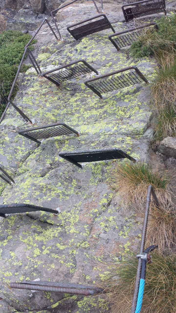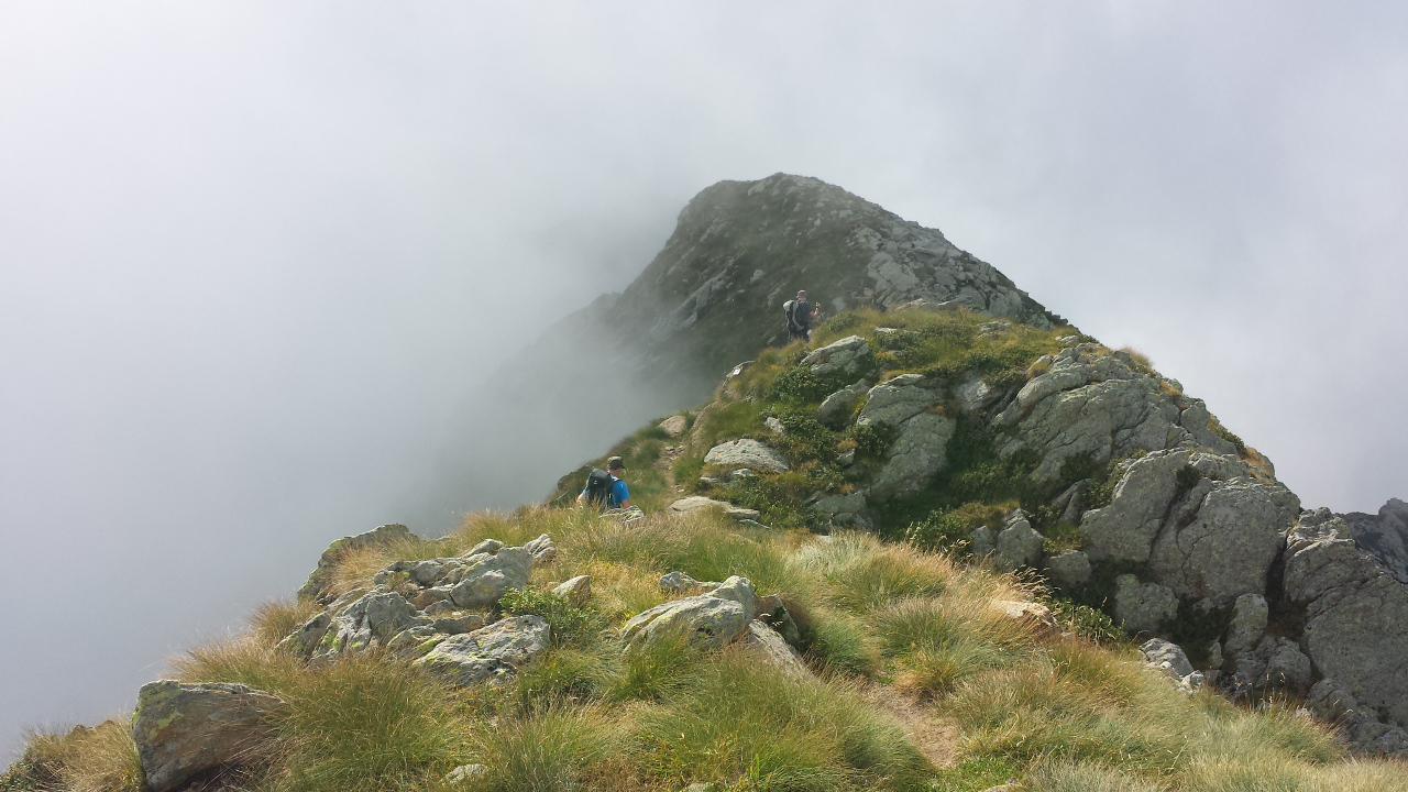 Klar, 5 Colli. Man muss sich vorstellen, man geht auf einem schmalen Bergkamm entlang, links nur Nebel oder Wolken (da wo unten irgendwo der andere Weg entlang läuft), rechts der Abhang, aber meist eine großartige Sicht auf das Tal. Manchmal ist der Kamm nur vier, fünf Meter breit, und auf dem verläuft eben der Pfad. Dann kommen Kletterstellen; diese sind teilweise mit Seilen gesichert, manchmal gibt es Trittstufen, und manchmal auch viele Trittstufen an fast senkrechten Wänden. Und das über fünf Pässe. Dies war definitiv unser bisher schwierigster Abschnitt, aber auch einer, der mit am meisten Spaß gemacht hat. Natürlich ging es bei unseren Unterhaltungen in erster Linie um Themen wie Bergrettung und die Frage, ob wir ankommen würden, und den Nebel. Es lief aber alles gut, es war wirklich eine sehr gute Entscheidung, nicht den Weg unten zu nehmen.